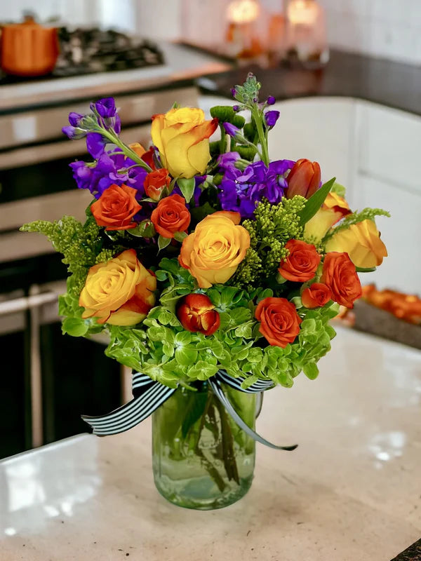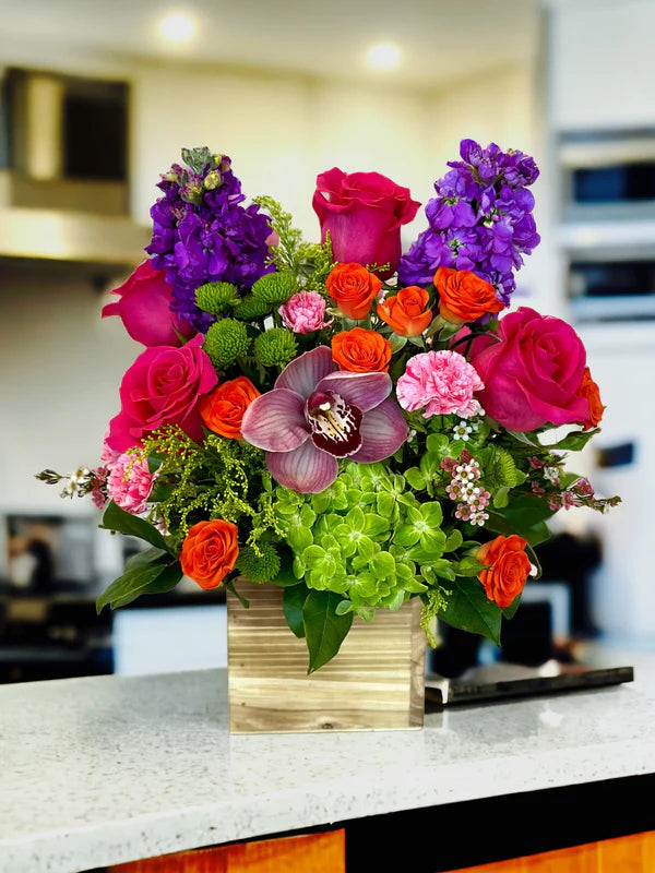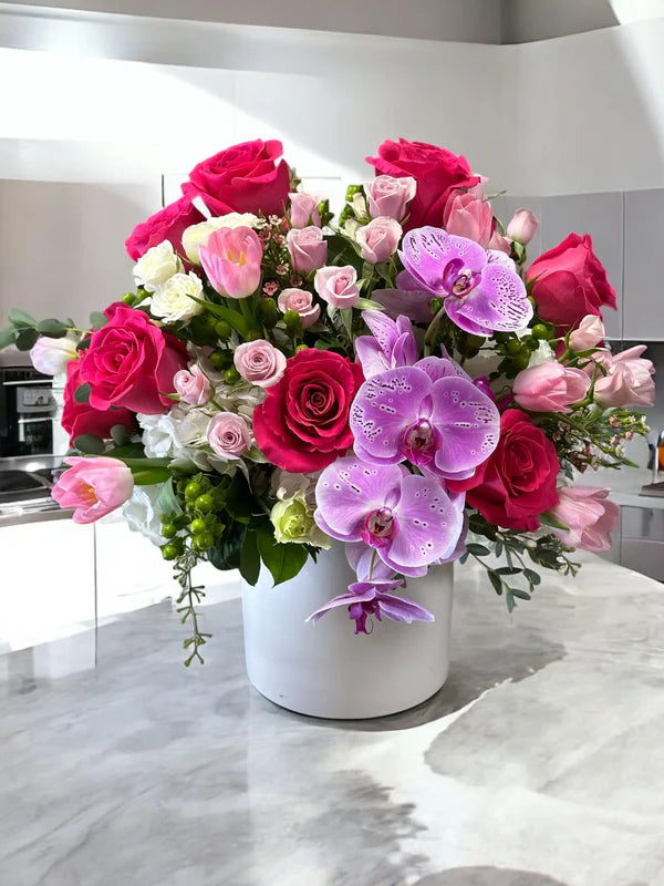 Vibrant Garden Luxe Floral Arrangement with Roses, Orchids & Lilies